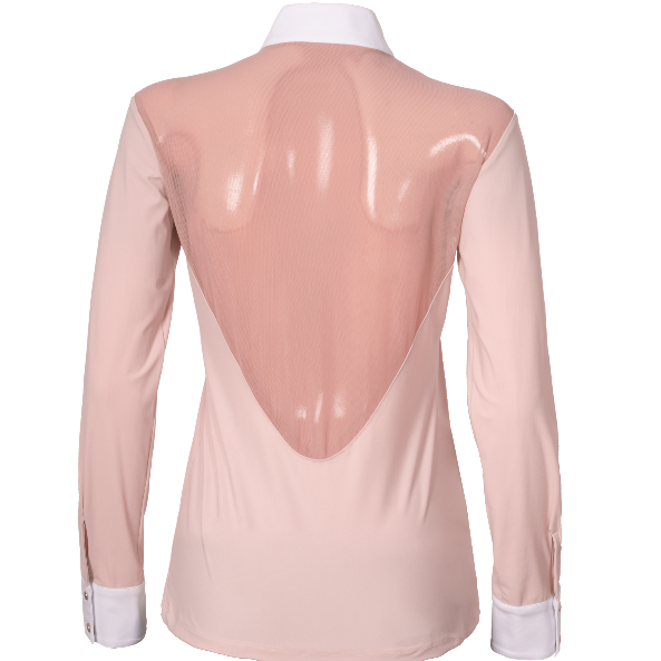 Designed for a beautiful and elegant silhouette, our LS2 offers the best fit and feel in a competition shirt. Made from a soft technical Italian fabric, it is fitted to enhance your shape but not bind to the body. Its mesh back keeps you cool and comfortable all day long. Finished with a petal zip collar, and brushed gold cuff snaps, this easy-to-wear show shirt looks stunning on every body. The fabric is made from recycled content, so you can also feel good about your fashion choices!