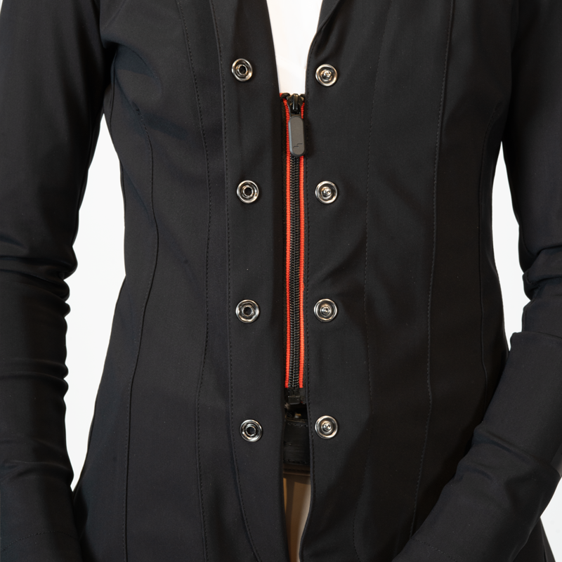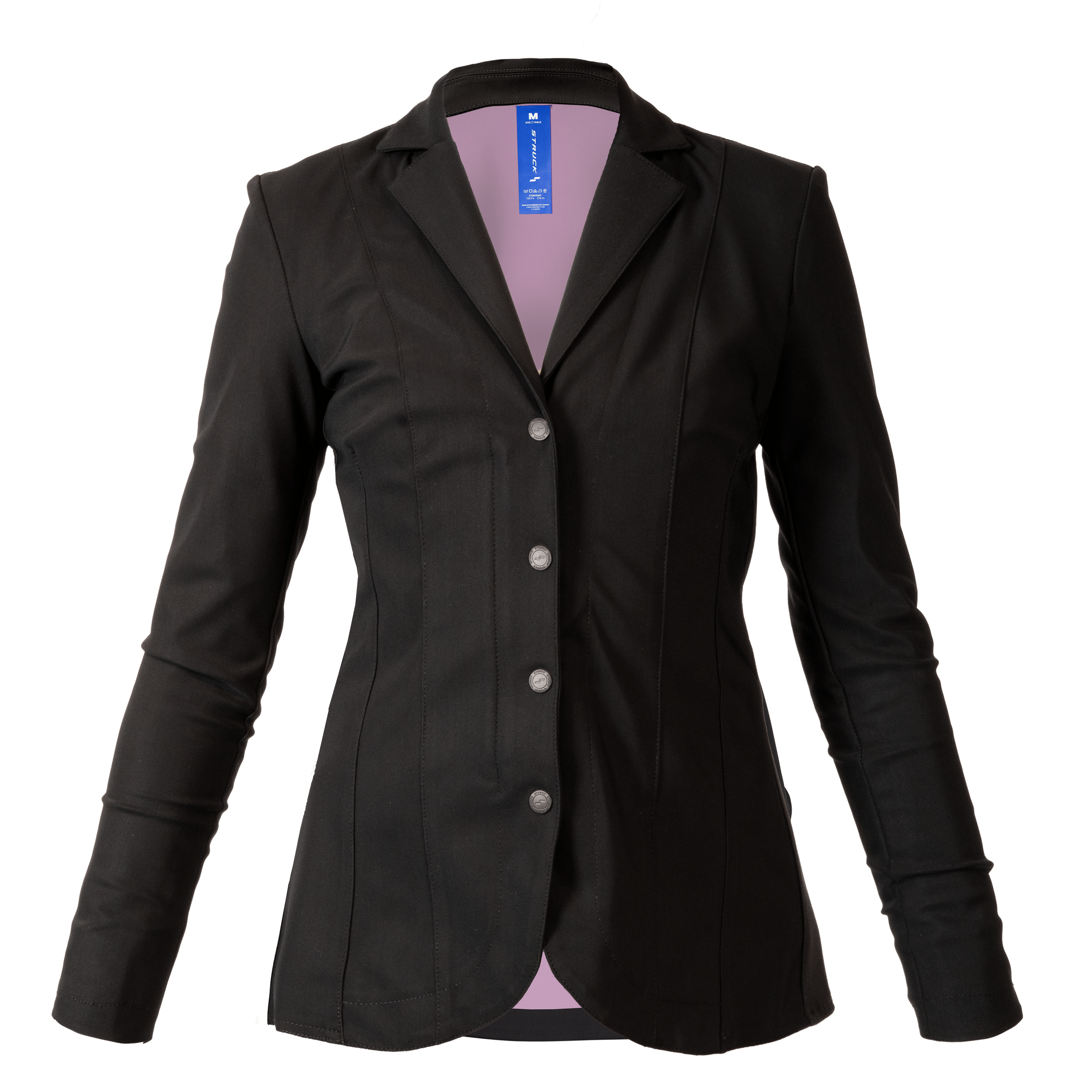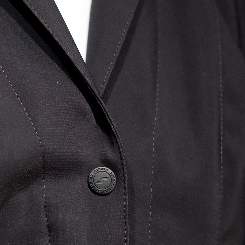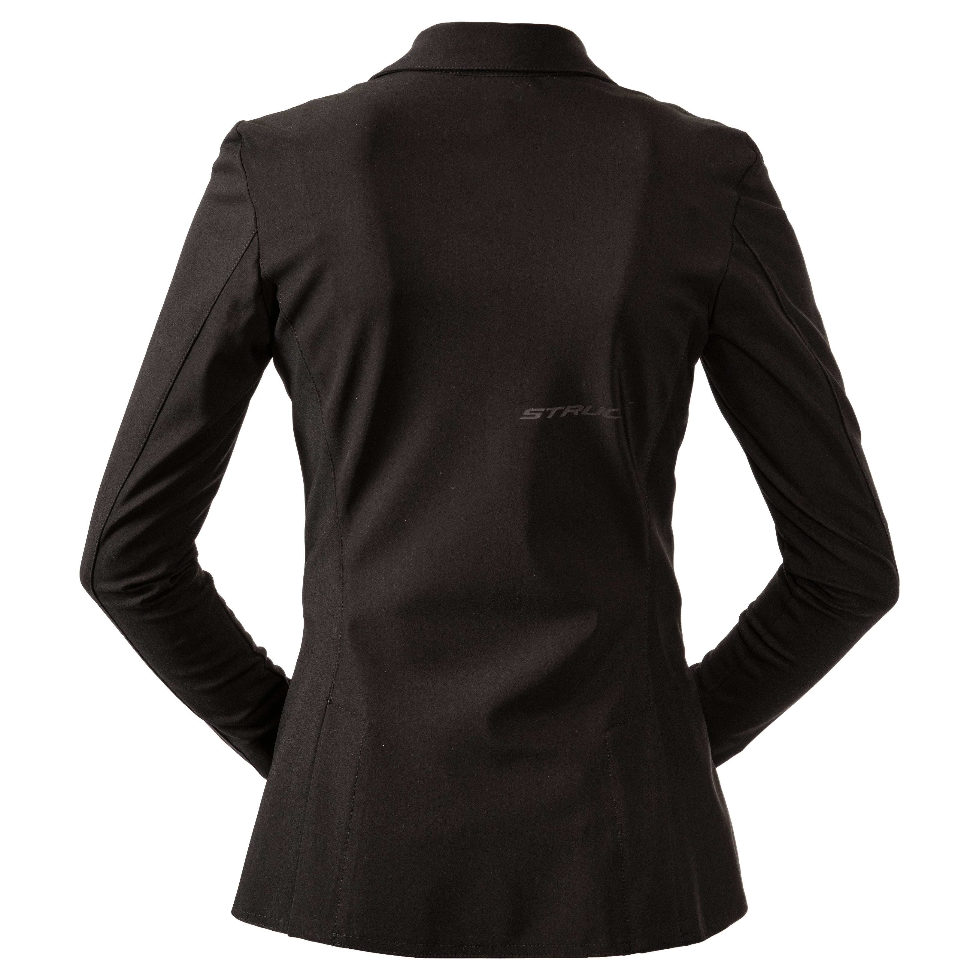 The STRUCK WJ10 combines cutting-edge technical fabrics with a timeless silhouette tailored specifically for the female rider. Lightweight, breathable, and water-resistant, this show jacket offers four-way stretch for full mobility and all-day comfort. Subtle details like contoured seams, tone on tone decoration, and a hidden zipper under classic snap buttons ensure a polished look without sacrificing performance. We've made this the perfect traditional jacket length for the hunters and equitations, complete with back vents for that perfect look in the ring.